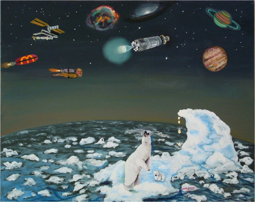 畫面的正前方,是一隻站在碎冰塊上仰天長嗥的北極熊。描述地球暖化後,北極地區冰山溶化;冰體支離破碎,北極熊失去棲息與捕食地,面對絕滅危機的景象。這原是我正在規劃雕塑創作的課題,竟然在這畫面上出現了。