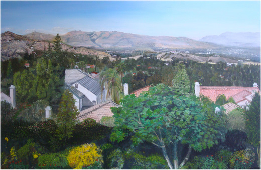 這張畫,原是應聖谷台灣同鄉會表演舞台背景的需要而創作。卻沒有因為是佈景而失卻藝術性。他把當地重要的讓他入目的建築與景觀,擇取編列而成。整個畫面安排井然穩當並沒有因為畫面大畫材多而失控,透視比例都沒有出現大礙眼的問題。雖還不是世界名畫,算起來已具有相當的成熟度與可看度。