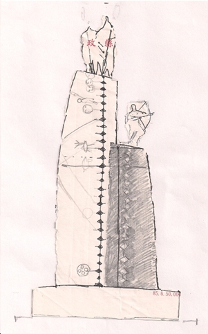 當第一次勘查地形環境後的第二天,我交給觀光局長楊樹煌一張縣府便條紙撕貼的模型試作(左圖)。並報告,這是結合馬諦斯的單線鉛筆速寫與剪貼的立體化綜合體。以天空雲霧為背襯的構思。這是他印象中從未有過的雕塑結構,他比著大拇指說:「勇」就這樣決定了整個設計的初稿。