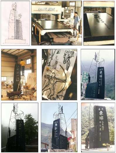 當然,到真正構想的完成,還花了一段時間。比如銅板或切割或鑄造的成本與割焊高溫導致變形問題,最後演化成精細的鐳射切割。焊接;噴砂;保固油漆塗料選擇;車吊;水泥台模板與灌漿;照明設備。這些在人生地不熟的深山野外,都得有完密的程序思考。其中鐳射板金是個人雕塑技術的一大超越。完美的底漆與最後的保護層是對抗水氣與有效保固的保證。