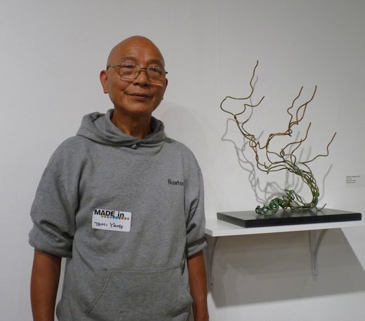 過去台美人畫家入選的有林逸凡「山景」入圍展出,今年則雕塑家楊平猷與抽象畫家劉白雙雙入選。楊平猷是學院出身的藝術家,又從事過建築事業,他擅長運用建築材料創作,這次入選的作品是以粗銅線雕塑出來的意象,名為昇華,是來自台灣民間故事八仙過海中呂洞賓與何仙姑的故事,講述成仙之前人性情慾的掙扎,由銅線雕底部的糾葛,往上延伸到豁然開展,作品尺寸不大,卻能在小空間中創造超乎空間的意境。