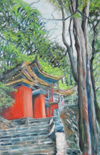 最近前往大陸旅遊,拍攝不少風景照。回美之後一一將之繪成油畫,心中很感興奮。藉此機會與大家分享。(昆明金殿一角之三)